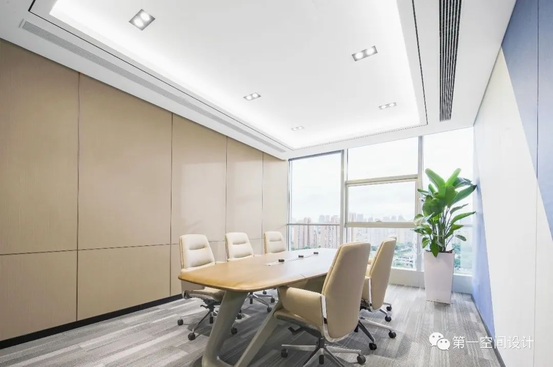 會(huì )議室整體干凈整潔,以木飾面和吸音板為主要材料。中會(huì )議室天花用六個(gè)雙頭斗膽燈在達到照明的基礎上,豐富了空間造型的細節。